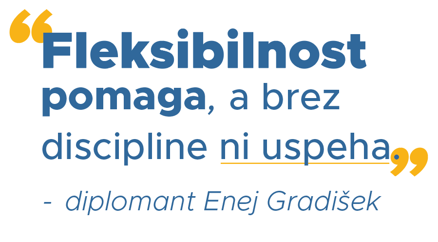 'V celoti mi je bil nov ter zanimiv koncept spletnega učenja, saj je moj prejšnji študij temeljil le na tradicionalnem načinu šolanja, ki je temeljil na fizični prisotnosti v šoli. Spletno učenje mi predstavlja ogromno svobode pri manipulaciji svojega časa, ki je v današnjem, vsaj mojem, pestrem vsakdanjiku, še kako pomemben.'