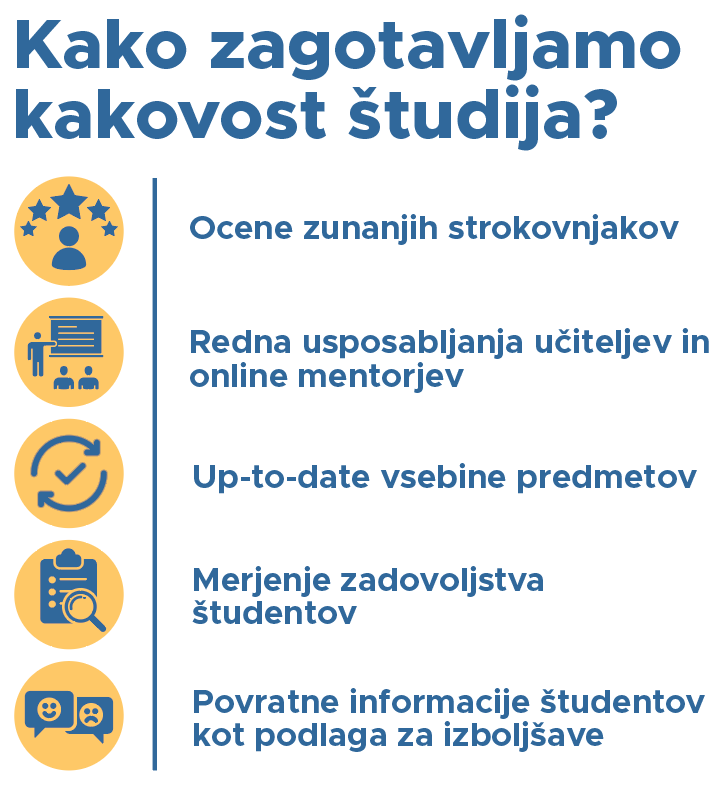 Študenti za opravljene naloge prejemate redno povratno informacijo visokošolskih učiteljev, ki vam omogoča spremljanje napredka in ciljno izboljševanje znanja.